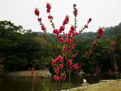 桃以密集成林为佳,花开时如火如荼,在园中常与垂柳相间,植于湖边溪畔,桃红柳绿,一派热闹。成林成片的桃花,总能勾起人们的神思遐想。