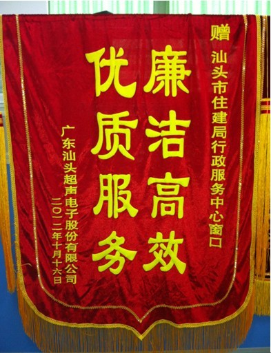 浏览次数:1737 近日,广东汕头超声电子股份有限公司将一面“廉洁高效、优质服务”的锦旗送到市住建局驻市行政服务中心窗口,对局服务窗口“急企业之所急、想企业之所想”,服务热情、快捷高效的工作作风,表示了高度的赞扬和深深的谢意。
