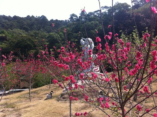 礐石的桃花有别于他处,2010年,礐石风景区对桃花涧进行了桃林优化改造,栽植了一批来自桃花故乡——江浙的桃花品种。与本地品种的桃花相比,其具有叶翠、花大、色红、重瓣、花期长且准的特点,特别是在今年气温偏暖的条件下,这批落户景区的“江南美女”依然比本地桃花的花期稍迟,仿佛在等待最适合最绚烂的时刻。经过景区工作人员三年的精心培育和养护,“姗姗来迟”的桃花依约在沐阳中次第开放,让春季踏青的赏花人又有了新去处。