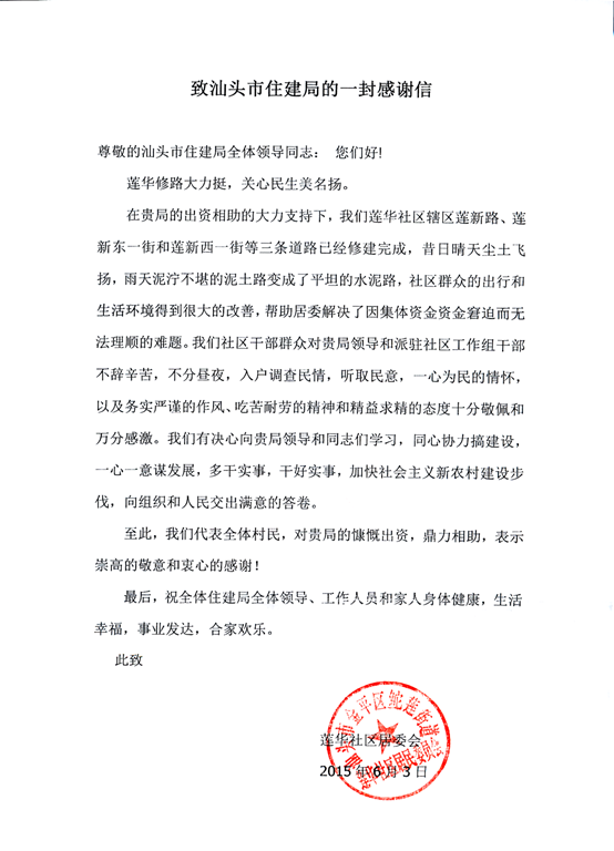 浏览次数:1394近日,汕头市金平区鮀莲街道莲华社区居委会到市住建局,送来了“建设民生工程,造福莲华百姓”的锦旗和感谢信,感谢市住建局在进驻莲华社区维稳期间,帮助社区修建辖区内莲新路、莲新东路一街和莲新西路一街等3条道路,为民办好事办实事的壮举。