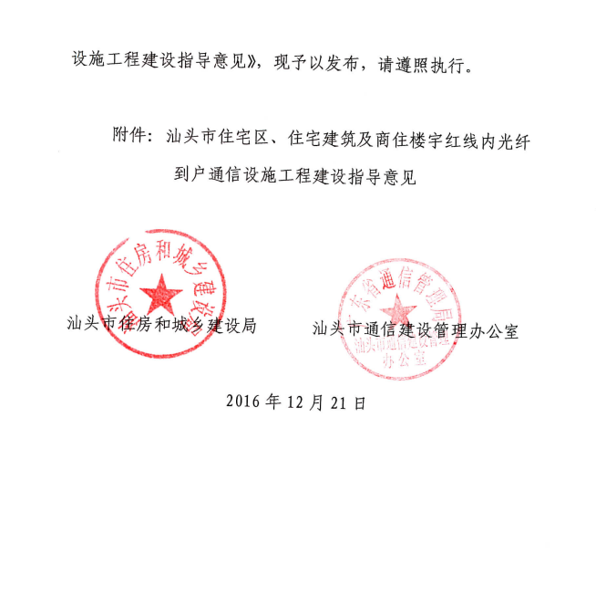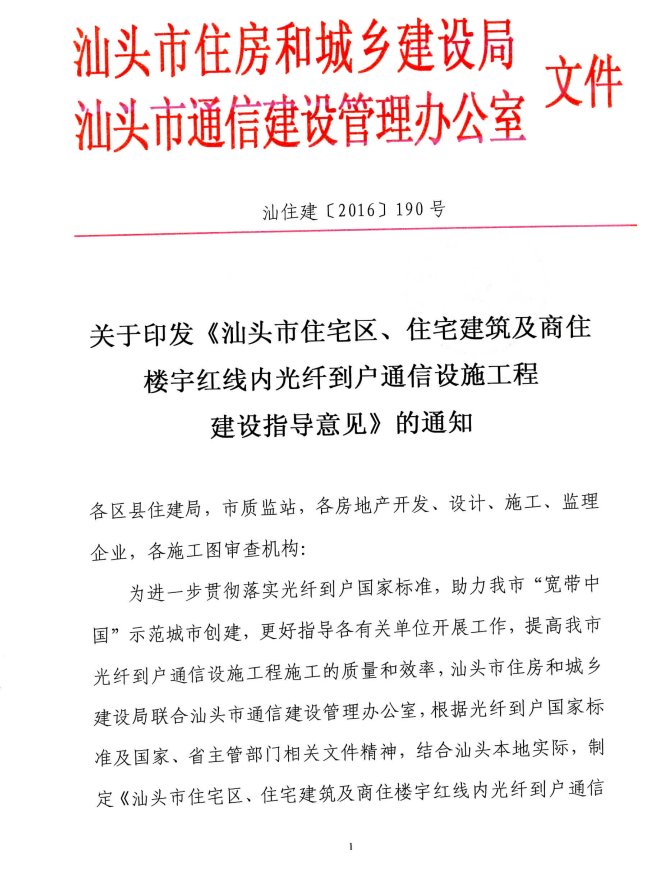 关于印发《汕头市住宅区、住宅建筑及商住楼宇红线内光纤到户通信设施工程建设指导意见》的通知汕住建[2016]190号