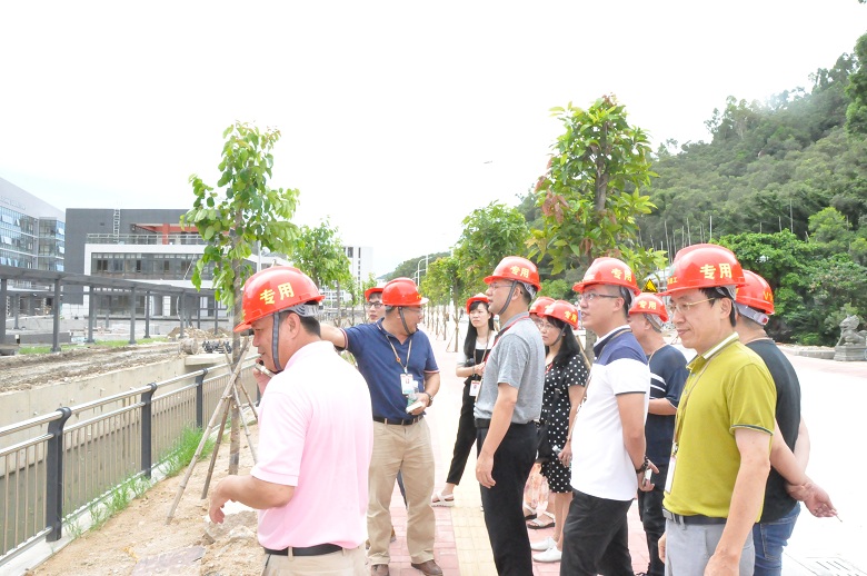 市造价站一行认真听取了市代建中心及施工、监理单位负责人对广东以色列理工学院项目情况的详细介绍,并通过实地参观学院教学楼、学生宿舍楼、食堂、景观渠及校园配套工程等,详细了解该项目大跨度钢结构、部分新型墙材等的施工细节和使用效果。